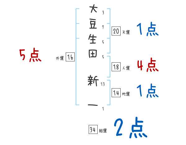 外運![]() | 大豆生田新一さんの外運は16画の5つ星!人望が厚く大きく発展する。逆転成功が見える。 生活面を象徴する運勢です。外部から受ける影響力を表し、結婚運、家庭運や職場、環境への順応性を表します。 |