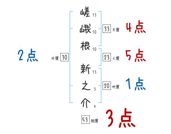 外運![]() | 嵯峨根新之介さんの外運は30画の2つ星!浮き沈みの激しさに注意しましょう。 生活面を象徴する運勢です。外部から受ける影響力を表し、結婚運、家庭運や職場、環境への順応性を表します。 |