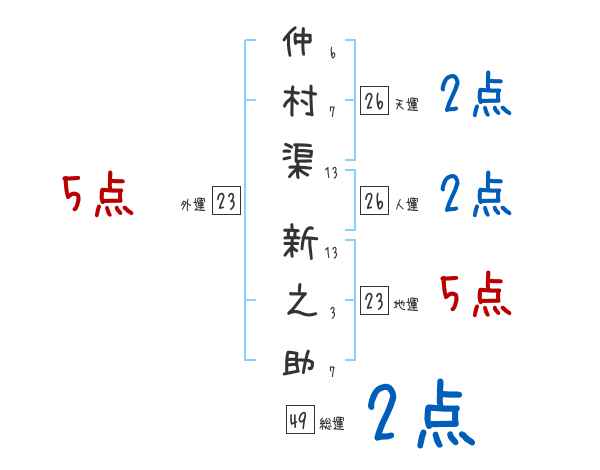天運![]() | 仲村渠新之助さんの天運は26画の2つ星!波瀾万丈かも。信頼できる人を大事にしましょう。 家系が持つ宿命的な運勢を表します。祖先から受け継いだ苗字ですので自分の力が及びません。家柄を象徴します。 |