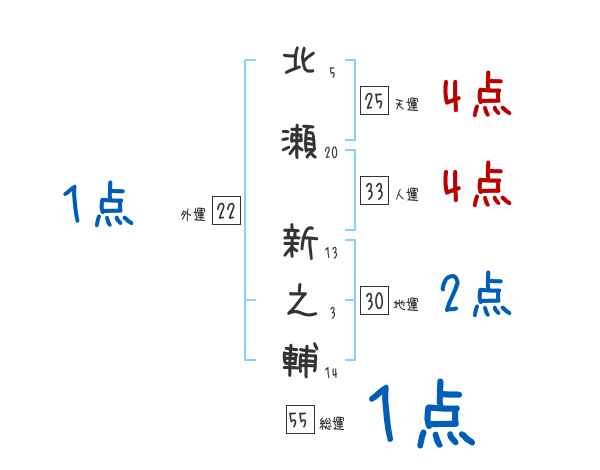 総運![]() | 北瀬新之輔さんの総運は55画の1つ星!欲張りな性格で軽率な行動に注意しましょう。病気に気をつけて。 あなたの人生を表す1番重要な運勢です。生涯を通じて影響する総合運となり、主に50歳以降の晩年期に影響を及ぼします。 |