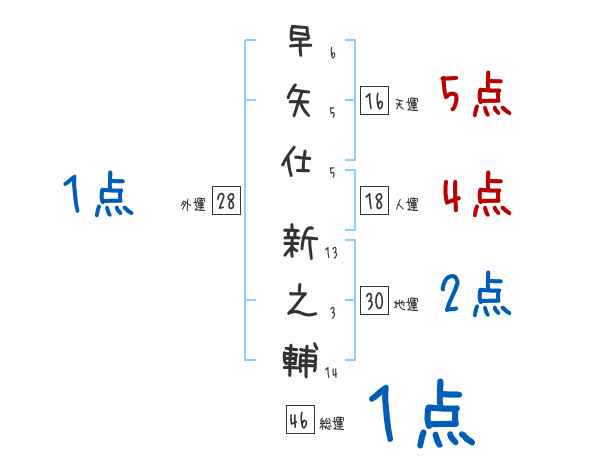 天運![]() | 早矢仕新之輔さんの天運は16画の5つ星!人望が厚く大きく発展する。逆転成功が見える。 家系が持つ宿命的な運勢を表します。祖先から受け継いだ苗字ですので自分の力が及びません。家柄を象徴します。 |