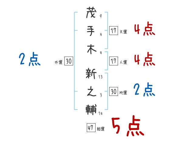 総運![]() | 茂手木新之輔さんの総運は47画の5つ星!実力が開花し発展する円満な人生。財に恵まれる。 あなたの人生を表す1番重要な運勢です。生涯を通じて影響する総合運となり、主に50歳以降の晩年期に影響を及ぼします。 |