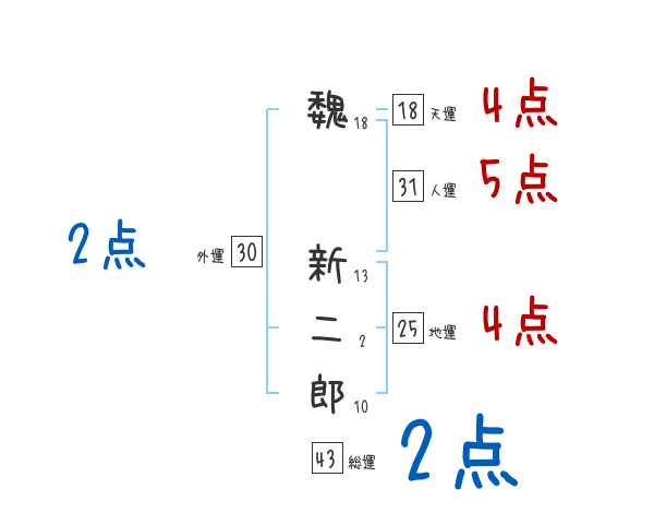 天運![]() | 魏新二郎さんの天運は18画の4つ星!情熱的で剛気。忍耐力があり信頼される。 家系が持つ宿命的な運勢を表します。祖先から受け継いだ苗字ですので自分の力が及びません。家柄を象徴します。 |