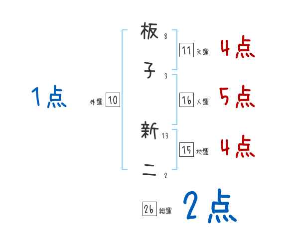 天運![]() | 板子新二さんの天運は11画の4つ星!着実に富や地位を得る幸運な人生。 家系が持つ宿命的な運勢を表します。祖先から受け継いだ苗字ですので自分の力が及びません。家柄を象徴します。 |