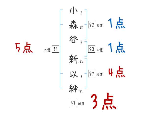 天運![]() | 小森谷新以絆さんの天運は22画の1つ星!努力することが苦手ないっぽう手先が器用。芸術性にも優れる。 家系が持つ宿命的な運勢を表します。祖先から受け継いだ苗字ですので自分の力が及びません。家柄を象徴します。 |