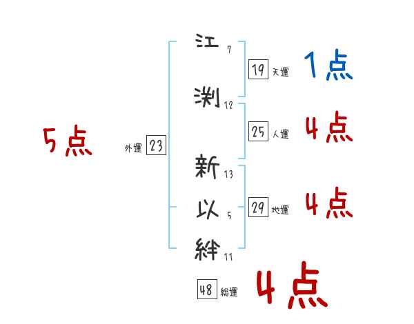 天運![]() | 江渕新以絆さんの天運は19画の1つ星!優れた才能を持ちますが、協調性が足りないことも。周りの人と協力する事を意識しましょう。 家系が持つ宿命的な運勢を表します。祖先から受け継いだ苗字ですので自分の力が及びません。家柄を象徴します。 |