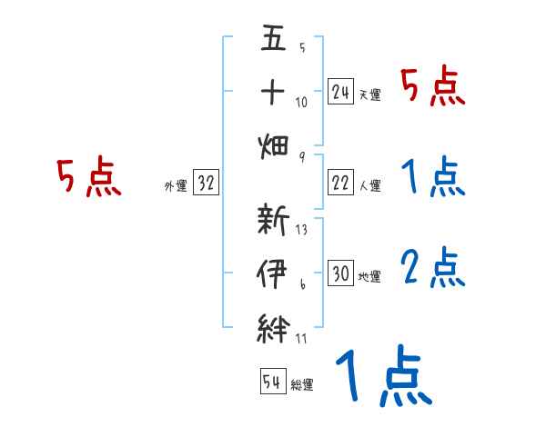 外運![]() | 五十畑新伊絆さんの外運は32画の5つ星!柔軟性があり成功する。チャンスが多く金運が良い。 生活面を象徴する運勢です。外部から受ける影響力を表し、結婚運、家庭運や職場、環境への順応性を表します。 |