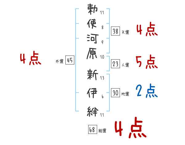 人運![]() | 勅使河原新伊絆さんの人運は23画の5つ星!想像力に優れ活力がある。一代で成功し名誉を手に入れる。 性格や才能などを表す2番目に重要な運勢です。人間関係や協調性、社会的な成功に影響します。主に20歳から50歳ぐらいまでの中年期の運勢を表します。 |