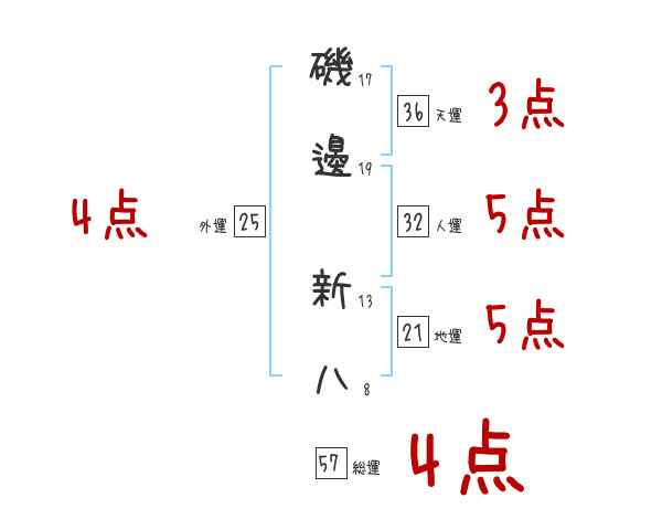 総運![]() | 磯邊新八さんの総運は57画の4つ星!向上心があり人望がある。地位を得る。 あなたの人生を表す1番重要な運勢です。生涯を通じて影響する総合運となり、主に50歳以降の晩年期に影響を及ぼします。 |