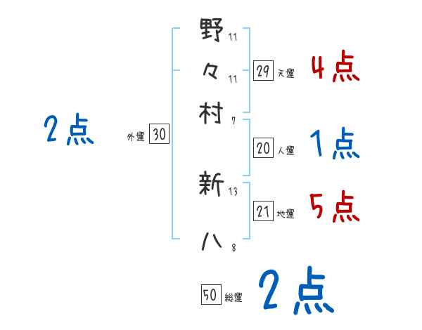 総運![]() | 野々村新八さんの総運は50画の2つ星!浮き沈みが激しく不安定。しりすぼみに衰退しやすいので注意しましょう。 あなたの人生を表す1番重要な運勢です。生涯を通じて影響する総合運となり、主に50歳以降の晩年期に影響を及ぼします。 |
