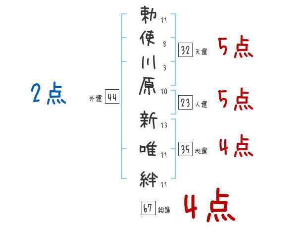 天運![]() | 勅使川原新唯絆さんの天運は32画の5つ星!柔軟性があり成功する。チャンスが多く金運が良い。 家系が持つ宿命的な運勢を表します。祖先から受け継いだ苗字ですので自分の力が及びません。家柄を象徴します。 |