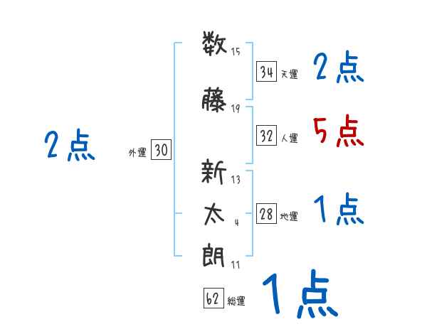 人運![]() | 数藤新太朗さんの人運は32画の5つ星!柔軟性があり成功する。チャンスが多く金運が良い。 性格や才能などを表す2番目に重要な運勢です。人間関係や協調性、社会的な成功に影響します。主に20歳から50歳ぐらいまでの中年期の運勢を表します。 |