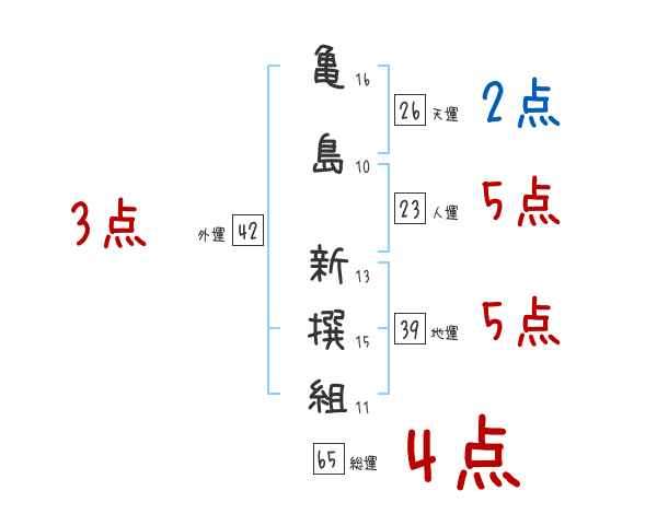 地運![]() | 亀島新撰組さんの地運は39画の5つ星!社交性に優れ人望が厚い。人の上に立ち成功する。 個性を表す基礎的な運勢です。性格形成や対人関係、行動力など家庭環境に影響されます。主に誕生してから20歳くらいまでの若年期の運勢を表します。 |
