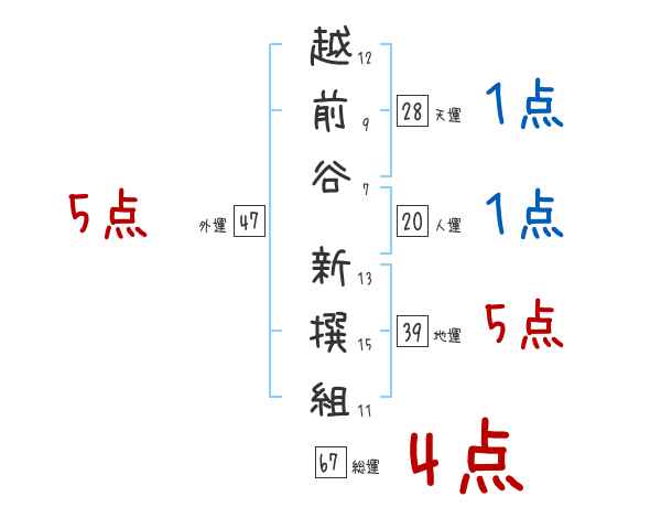 外運![]() | 越前谷新撰組さんの外運は47画の5つ星!実力が開花し発展する円満な人生。財に恵まれる。 生活面を象徴する運勢です。外部から受ける影響力を表し、結婚運、家庭運や職場、環境への順応性を表します。 |