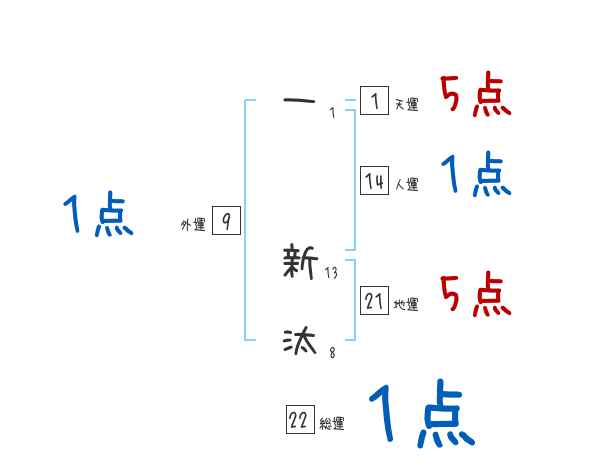 天運![]() | 一新汰さんの天運は1画の5つ星!行動力、指導力があり出世し繁栄する。幸運に恵まれる。 家系が持つ宿命的な運勢を表します。祖先から受け継いだ苗字ですので自分の力が及びません。家柄を象徴します。 |