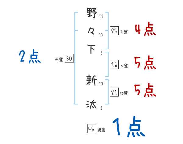 天運![]() | 野々下新汰さんの天運は25画の4つ星!個性があり才能があふれる。強運の持ち主で発展する。 家系が持つ宿命的な運勢を表します。祖先から受け継いだ苗字ですので自分の力が及びません。家柄を象徴します。 |