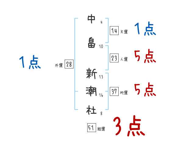 総運![]() | 中畠新潮社さんの総運は51画の3つ星!変化が激しく、危険に注意。堅実な性格。 あなたの人生を表す1番重要な運勢です。生涯を通じて影響する総合運となり、主に50歳以降の晩年期に影響を及ぼします。 |
