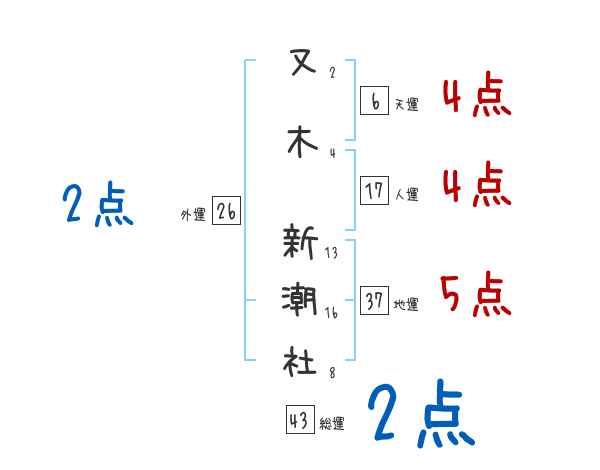 天運![]() | 又木新潮社さんの天運は6画の4つ星!慎重な努力家で信頼を得る。誠実な精神で向上心に優れる。 家系が持つ宿命的な運勢を表します。祖先から受け継いだ苗字ですので自分の力が及びません。家柄を象徴します。 |