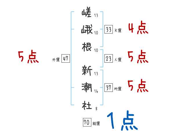 人運![]() | 嵯峨根新潮社さんの人運は23画の5つ星!想像力に優れ活力がある。一代で成功し名誉を手に入れる。 性格や才能などを表す2番目に重要な運勢です。人間関係や協調性、社会的な成功に影響します。主に20歳から50歳ぐらいまでの中年期の運勢を表します。 |