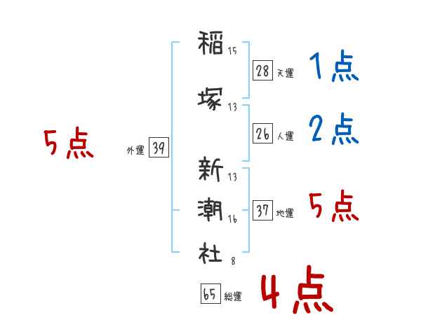 天運![]() | 稲塚新潮社さんの天運は28画の1つ星!家庭環境に注意。スポーツで活躍できる能力があるかも。 家系が持つ宿命的な運勢を表します。祖先から受け継いだ苗字ですので自分の力が及びません。家柄を象徴します。 |