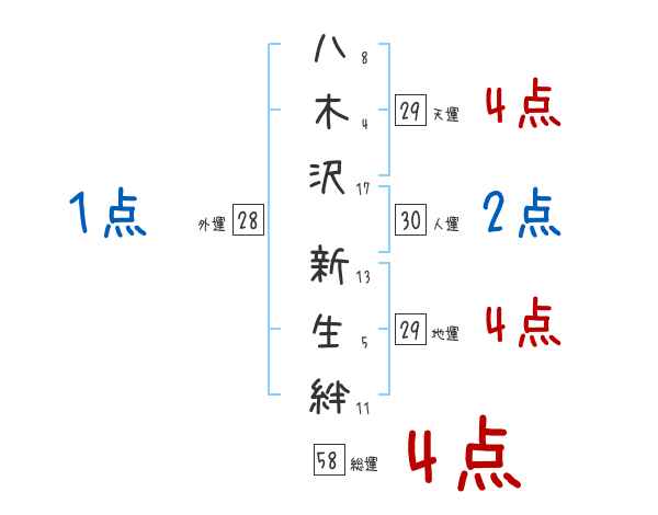総運![]() | 八木沢新生絆さんの総運は58画の4つ星!安定した生活。大器晩成タイプ。 あなたの人生を表す1番重要な運勢です。生涯を通じて影響する総合運となり、主に50歳以降の晩年期に影響を及ぼします。 |