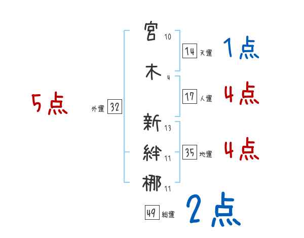 外運![]() | 宮木新絆梛さんの外運は32画の5つ星!柔軟性があり成功する。チャンスが多く金運が良い。 生活面を象徴する運勢です。外部から受ける影響力を表し、結婚運、家庭運や職場、環境への順応性を表します。 |