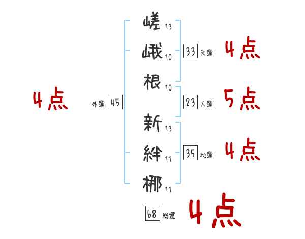 天運![]() | 嵯峨根新絆梛さんの天運は33画の4つ星!権力志向でプライドが高い。勇気があり運を切り開き成功する。 家系が持つ宿命的な運勢を表します。祖先から受け継いだ苗字ですので自分の力が及びません。家柄を象徴します。 |