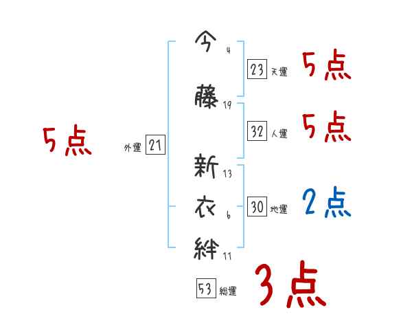 人運![]() | 今藤新衣絆さんの人運は32画の5つ星!柔軟性があり成功する。チャンスが多く金運が良い。 性格や才能などを表す2番目に重要な運勢です。人間関係や協調性、社会的な成功に影響します。主に20歳から50歳ぐらいまでの中年期の運勢を表します。 |