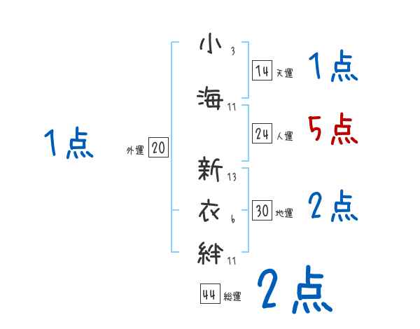 天運![]() | 小海新衣絆さんの天運は14画の1つ星!人に対して優しいがストレスを溜め込みがち。人間関係のトラブルを避けるよう気をつけましょう。 家系が持つ宿命的な運勢を表します。祖先から受け継いだ苗字ですので自分の力が及びません。家柄を象徴します。 |