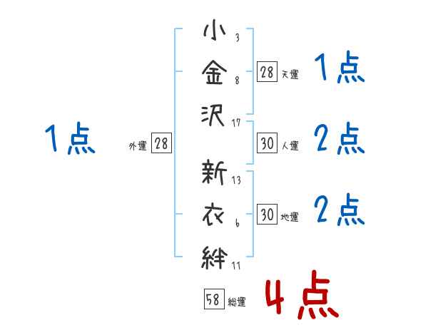 天運![]() | 小金沢新衣絆さんの天運は28画の1つ星!家庭環境に注意。スポーツで活躍できる能力があるかも。 家系が持つ宿命的な運勢を表します。祖先から受け継いだ苗字ですので自分の力が及びません。家柄を象徴します。 |