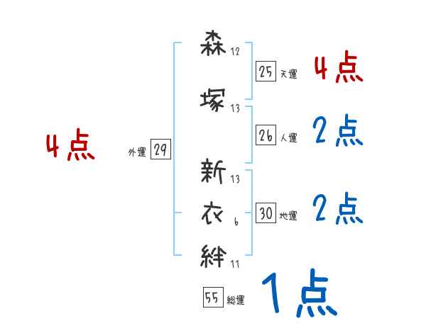 天運![]() | 森塚新衣絆さんの天運は25画の4つ星!個性があり才能があふれる。強運の持ち主で発展する。 家系が持つ宿命的な運勢を表します。祖先から受け継いだ苗字ですので自分の力が及びません。家柄を象徴します。 |