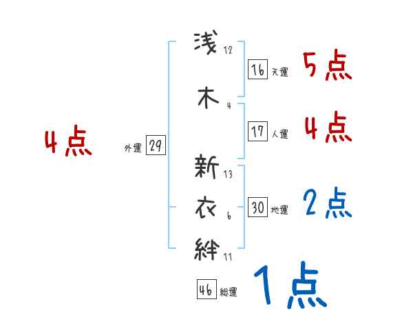 天運![]() | 浅木新衣絆さんの天運は16画の5つ星!人望が厚く大きく発展する。逆転成功が見える。 家系が持つ宿命的な運勢を表します。祖先から受け継いだ苗字ですので自分の力が及びません。家柄を象徴します。 |