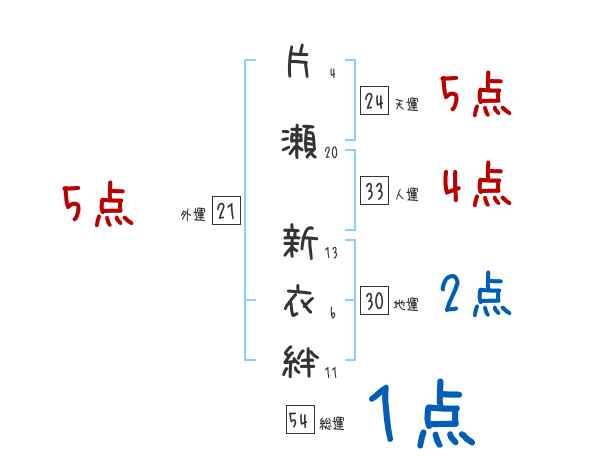 外運![]() | 片瀬新衣絆さんの外運は21画の5つ星!統率力がある。独立し成功する。名誉を手に入れる。 生活面を象徴する運勢です。外部から受ける影響力を表し、結婚運、家庭運や職場、環境への順応性を表します。 |
