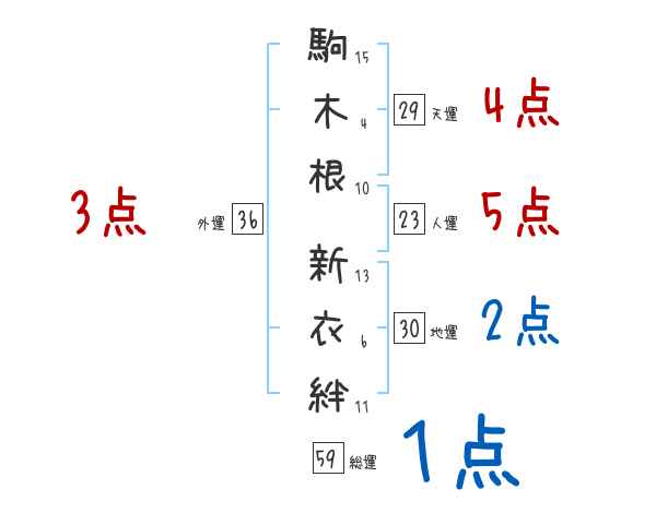 外運![]() | 駒木根新衣絆さんの外運は36画の3つ星!先見性が豊かです。多少神経質で苦労することも。 生活面を象徴する運勢です。外部から受ける影響力を表し、結婚運、家庭運や職場、環境への順応性を表します。 |