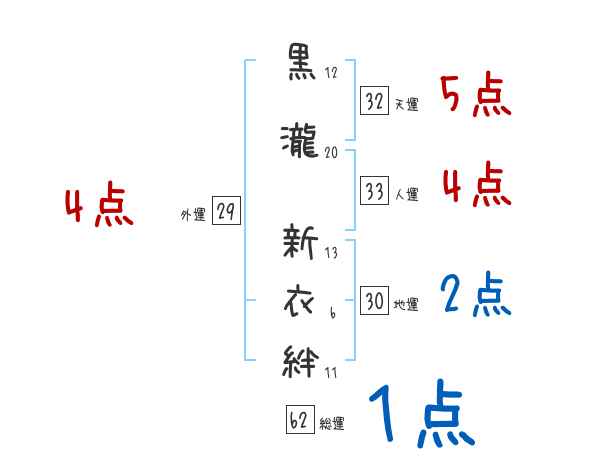 天運![]() | 黒瀧新衣絆さんの天運は32画の5つ星!柔軟性があり成功する。チャンスが多く金運が良い。 家系が持つ宿命的な運勢を表します。祖先から受け継いだ苗字ですので自分の力が及びません。家柄を象徴します。 |