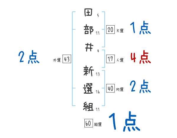 総運![]() | 田部井新選組さんの総運は60画の1つ星!悲観的で迷いやすい。波乱が多く損をしないように。 あなたの人生を表す1番重要な運勢です。生涯を通じて影響する総合運となり、主に50歳以降の晩年期に影響を及ぼします。 |