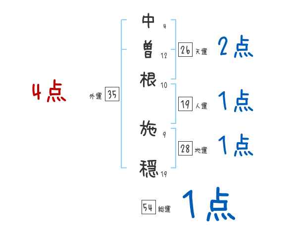 外運![]() | 中曽根施穏さんの外運は35画の4つ星!温厚な性格で感受性が高い。穏和な性格で人望が厚い。 生活面を象徴する運勢です。外部から受ける影響力を表し、結婚運、家庭運や職場、環境への順応性を表します。 |
