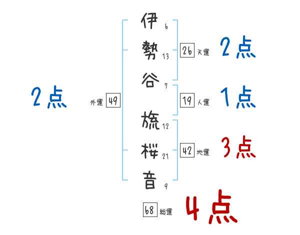総運![]() | 伊勢谷旒桜音さんの総運は68画の4つ星!潜在能力が高く集中力が高い。勤勉に励み発展する。 あなたの人生を表す1番重要な運勢です。生涯を通じて影響する総合運となり、主に50歳以降の晩年期に影響を及ぼします。 |