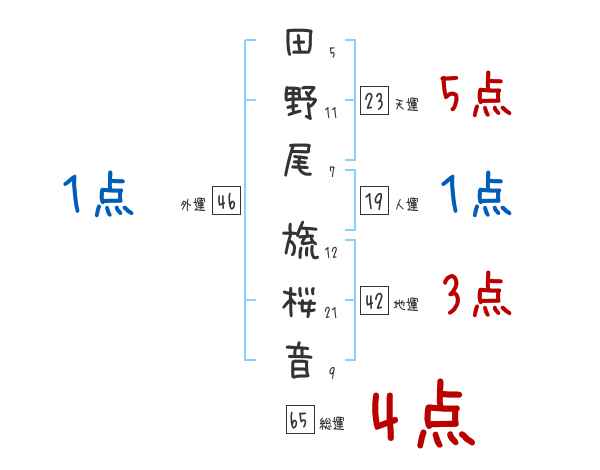 天運![]() | 田野尾旒桜音さんの天運は23画の5つ星!想像力に優れ活力がある。一代で成功し名誉を手に入れる。 家系が持つ宿命的な運勢を表します。祖先から受け継いだ苗字ですので自分の力が及びません。家柄を象徴します。 |
