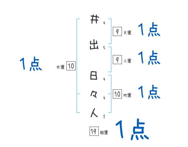 外運![]() | 井出日々人さんの外運は10画の1つ星!不安を感じやすい傾向。ストレスを抱えないように注意しましょう。 生活面を象徴する運勢です。外部から受ける影響力を表し、結婚運、家庭運や職場、環境への順応性を表します。 |