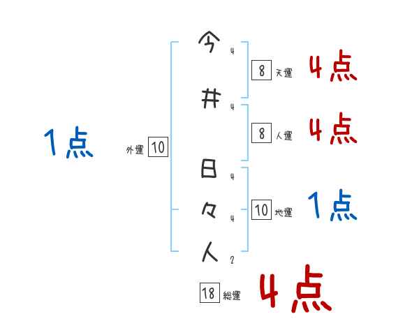 外運![]() | 今井日々人さんの外運は10画の1つ星!不安を感じやすい傾向。ストレスを抱えないように注意しましょう。 生活面を象徴する運勢です。外部から受ける影響力を表し、結婚運、家庭運や職場、環境への順応性を表します。 |