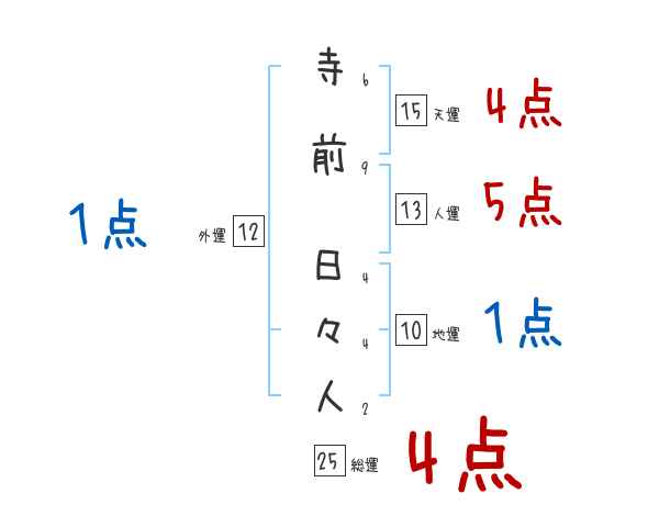人運![]() | 寺前日々人さんの人運は13画の5つ星!才能に恵まれ人気がある。名声を手に入れる。円満な人生。 性格や才能などを表す2番目に重要な運勢です。人間関係や協調性、社会的な成功に影響します。主に20歳から50歳ぐらいまでの中年期の運勢を表します。 |