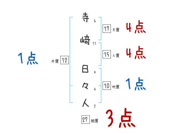 外運![]() | 寺﨑日々人さんの外運は12画の1つ星!簡単な失敗で諦めてしまいやすいかも。着実に行動すると良いでしょう。 生活面を象徴する運勢です。外部から受ける影響力を表し、結婚運、家庭運や職場、環境への順応性を表します。 |