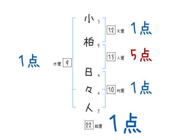 外運![]() | 小柏日々人さんの外運は9画の1つ星!消極的で才能を発揮することが苦手なことも。周りの意見に耳を傾けましょう。 生活面を象徴する運勢です。外部から受ける影響力を表し、結婚運、家庭運や職場、環境への順応性を表します。 |