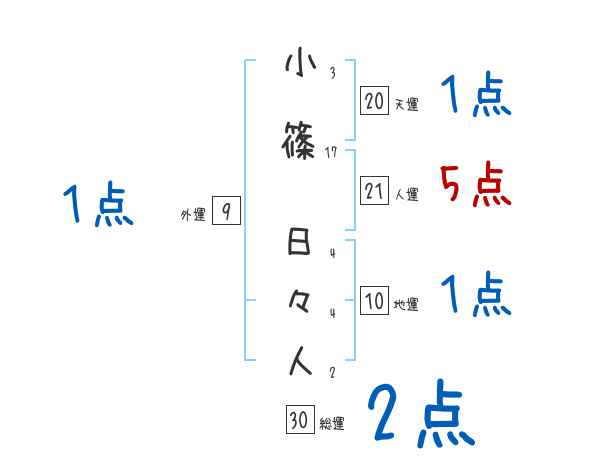 人運![]() | 小篠日々人さんの人運は21画の5つ星!統率力がある。独立し成功する。名誉を手に入れる。 性格や才能などを表す2番目に重要な運勢です。人間関係や協調性、社会的な成功に影響します。主に20歳から50歳ぐらいまでの中年期の運勢を表します。 |