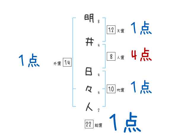 天運![]() | 明井日々人さんの天運は12画の1つ星!簡単な失敗で諦めてしまいやすいかも。着実に行動すると良いでしょう。 家系が持つ宿命的な運勢を表します。祖先から受け継いだ苗字ですので自分の力が及びません。家柄を象徴します。 |