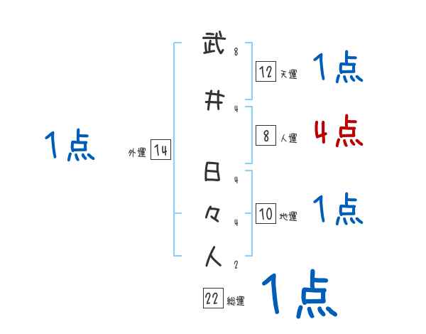 外運![]() | 武井日々人さんの外運は14画の1つ星!人に対して優しいがストレスを溜め込みがち。人間関係のトラブルを避けるよう気をつけましょう。 生活面を象徴する運勢です。外部から受ける影響力を表し、結婚運、家庭運や職場、環境への順応性を表します。 |