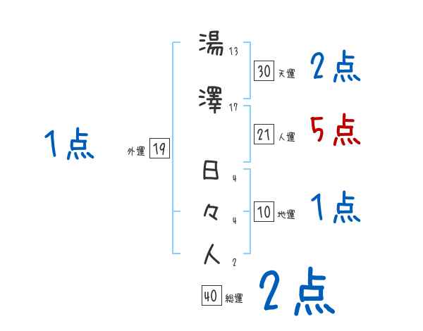 天運![]() | 湯澤日々人さんの天運は30画の2つ星!浮き沈みの激しさに注意しましょう。 家系が持つ宿命的な運勢を表します。祖先から受け継いだ苗字ですので自分の力が及びません。家柄を象徴します。 |
