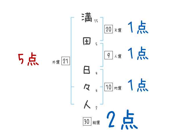 総運![]() | 満田日々人さんの総運は30画の2つ星!浮き沈みの激しさに注意しましょう。 あなたの人生を表す1番重要な運勢です。生涯を通じて影響する総合運となり、主に50歳以降の晩年期に影響を及ぼします。 |