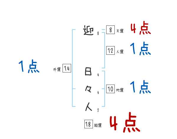 外運![]() | 迎日々人さんの外運は14画の1つ星!人に対して優しいがストレスを溜め込みがち。人間関係のトラブルを避けるよう気をつけましょう。 生活面を象徴する運勢です。外部から受ける影響力を表し、結婚運、家庭運や職場、環境への順応性を表します。 |